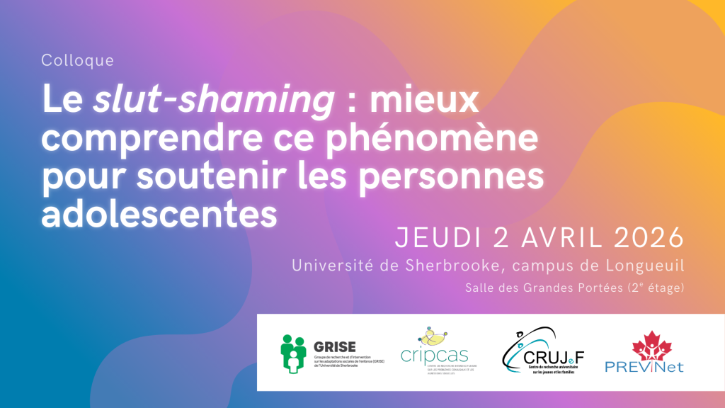 Le 2 avril 2026 se tiendra le colloque « Le slut-shaming : mieux comprendre ce phénomène pour soutenir les personnes adolescentes ». Cette journée d’échange et de réflexion se déroulera sur le campus de Longueuil de l’Université de Sherbrooke (150 Place Charles-le-Moyne, Longueuil).